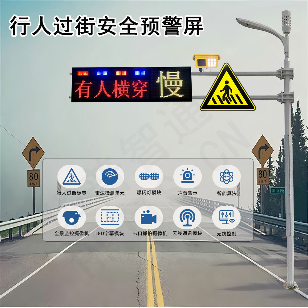 行人过街安全预警系统,路口来人检测系统,行人过斑马线安全预警系统。车辆检测:24GHz车辆检测雷达,检测距离120~150米。可区分来去向,车流量统计。速度范围:5~300km/h;
